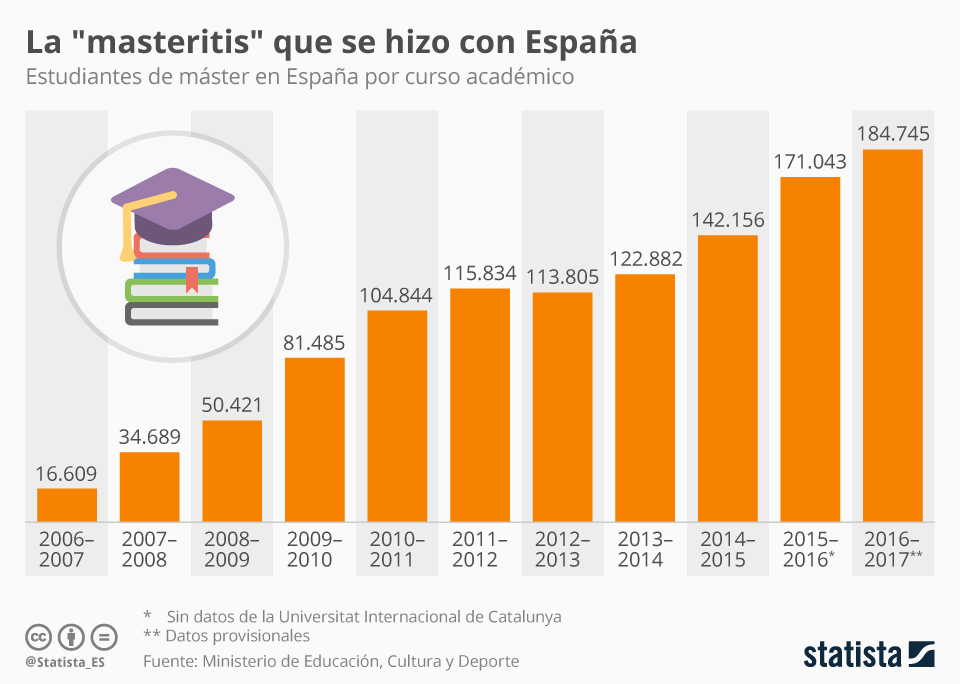 El estudio titulado Empleabilidad de la población cualificada, de la EAE Business School, deja ver que la demanda de estos estudios de postgrado se ha incrementado casi un 8% en el pasado año. Además, en la última década la oferta de másteres se ha cuadruplicado, ni más ni menos.
