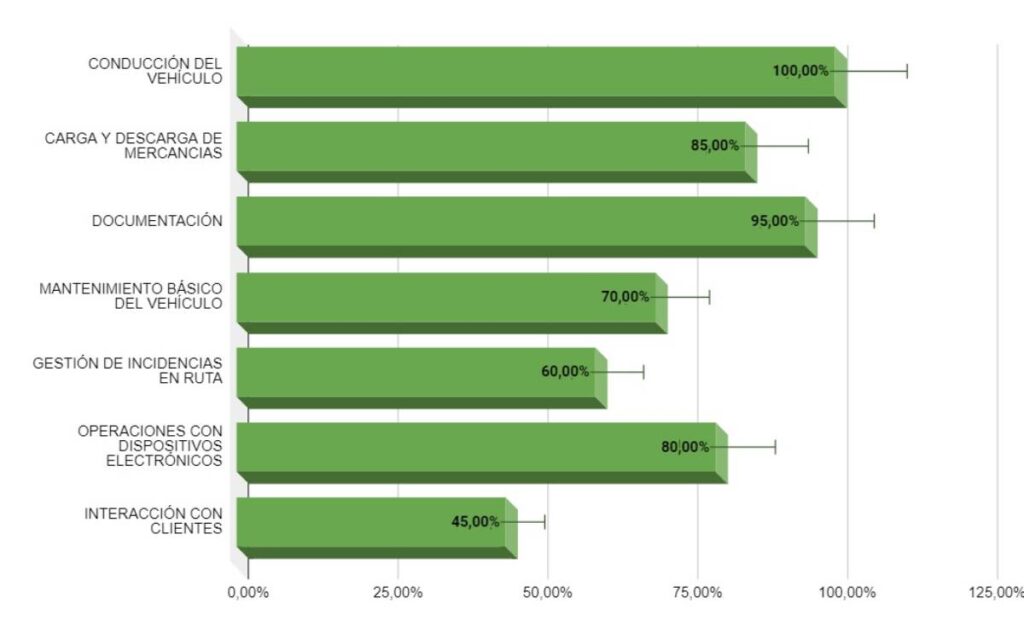 La conducción del vehículo es una tarea universalmente realizada por todos los camioneros encuestados, alcanzando un 100%. Además, una gran mayoría, el 95%, se encarga de gestionar la documentación necesaria para el transporte. La carga y descarga de mercancías también es una actividad común, llevada a cabo por el 85% de los camioneros.