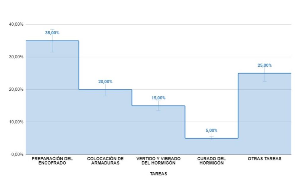 También hay que tener en cuenta que , el encofrador dedica un 25% de su tiempo a diversas tareas complementarias como el transporte de materiales y la lectura de planos, actividades que son esenciales para la correcta ejecución del proyecto y la adaptación a las especificaciones técnicas.