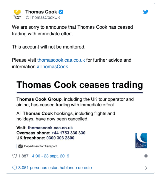 Más de 200 millones de libras eran las que el touroperador necesitaba para reflotar la compañía. Pero la Autoridad de Aviación Civil hoy ha confirmado que todas las reservas del grupo Thomas Cook, incluyendo vacaciones y vuelos, han sido canceladas. Muchos apuntan como las principales razones de esta quiebra en primer lugar a la incertidumbre que existe en toda Europa por el desenlace del Brexit. Esto sumado a la depreciación de la libra y a que la economía europea va cojeando han desencadenado una pésimo final al touroperador.Peter Frankhauser, presidente ejecutivo se ha disculpado tanto con sus empleados como con sus proveedores y los clientes. El lamenta mucho que no se haya llegado a ningún acuerdo después de tanta negociación con la china Fosun principal accionista de la agencia de viajes.A través de un comunicado en twitter la compañía ha dado a conocer esta quiebra a sus usuarios.
