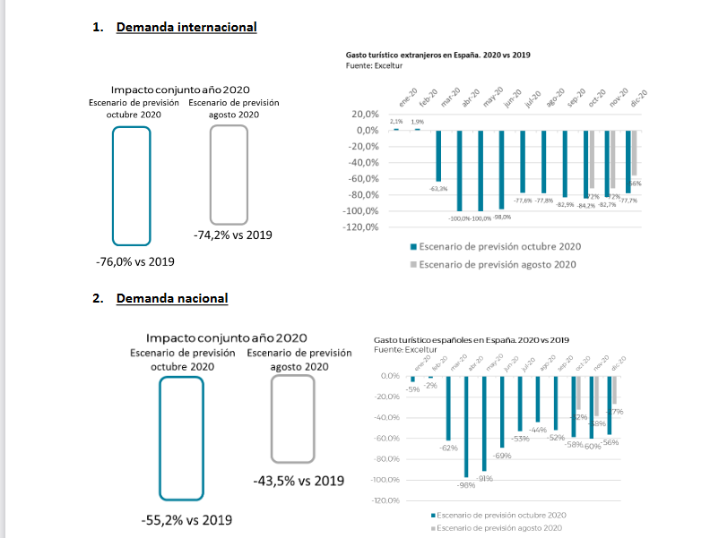 Además, es uno de los más afectados por la pandemia. Según una noticia reciente publicada en la web de Exceltur (ver gráficas), el verano se ha cerrado con casi 40.000 millones de euros menos derivados de actividades turísticas solo en los meses de julio, agosto y septiembre, respecto al mismo periodo del año anterior. Sin contar con octubre, siguen afectados, según la misma fuente, 595.000 empleos, por reducción de afiliados y personas en ERTE. Mientras que en el resto de la economía del país la bajada ha sido de menos de un 4%, en el turismo el empleo se ha dañado en un 28,5% en relación al mismo momento de 2019.