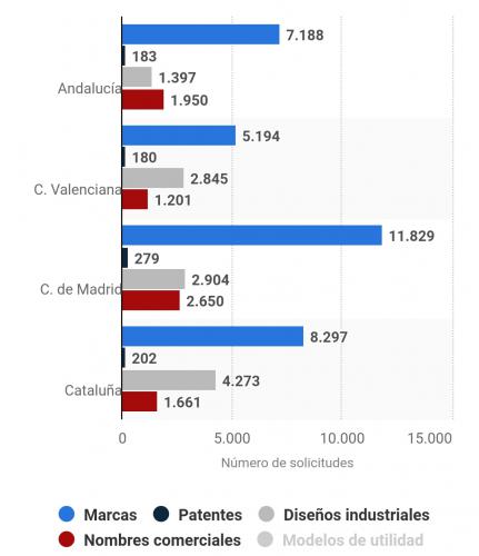 Por otro lado, la siguiente estadística nos muestra las CC. AA. que registraron un mayor volumen de solicitudes de propiedad intelectual en 2019, divididas por diferente modalidad: