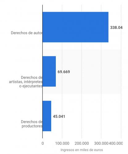 Para que nos hagamos una mejor ideal del sector, vamos a observar un par de estadísticas. En la siguiente, podemos echar un vistazo a los ingresos registrados por gestión de derechos de propiedad intelectual en nuestro país el pasado año, diferenciados por tipo:
