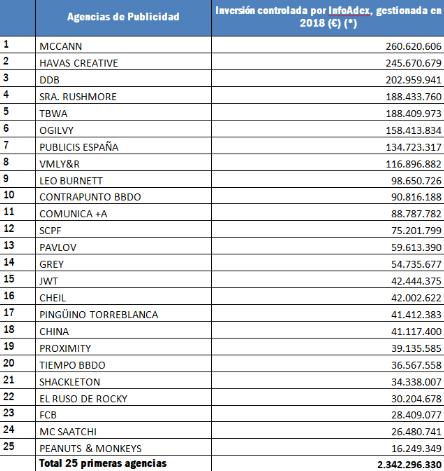 En el siguiente gráfico, podemos ver las principales agencias de publicidad de nuestro país según cantidad de inversión: