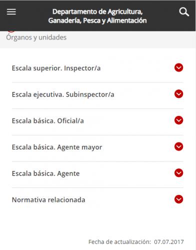 Tienes en la escala superior a los inspectores/as; una escala ejecutiva con los subinspectores/as y una escala básica formada por (por orden de jerarquía mayor a menor) oficial/a, agente mayor y agente rural. (La captura es de la página de Agricultura de la Generalitat)