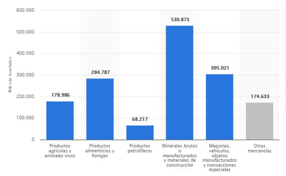 Como vemos, a la cabeza encontramos el transporte de minerales brutos o manufacturados, así como los materiales de construcción, seguido del transporte de máquinas, vehículos, objetos manufacturados y otras transacciones especiales.