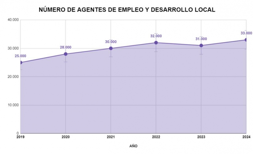 Sin embargo, en 2023, se registró una ligera disminución en el número de agentes, descendiendo a 31,000. A pesar de esta pequeña caída, se prevé que en 2024 el número de Agentes de Empleo y Desarrollo Local alcance los 33,000, continuando con la tendencia general de crecimiento en los últimos años.