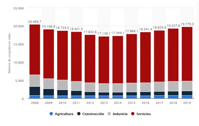 En el presente gráfico podemos apreciar una evolución del número de ocupados en nuestro país entre 2008 y 2019, dividida por sectores económicos. En el primer año, en España había cerca de 2,5 millones de trabajadores en el sector de la construcción, una cifra que no cesó de reducirse hasta el año 2014.