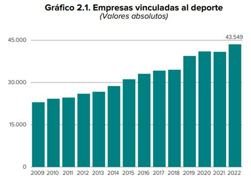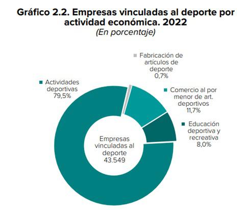 La cantidad de empresas registradas en el Directorio Central de Empresas (DIRCE), cuya actividad económica principal está relacionada con el ámbito deportivo, alcanzó las 43.549 a principios de 2022, representando el 1,3% del total de empresas incluidas en el DIRCE. Un 79,5% de estas empresas corresponde a actividades deportivas, como la gestión de instalaciones, las actividades de los clubes deportivos o de gimnasios, totalizando 34.636 empresas.