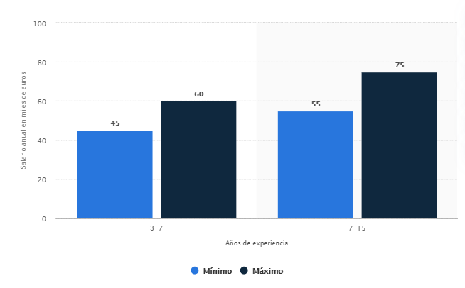 Como hemos visto en el gráfico anterior, los sueldos que se registran para los arquitectos de datos no son nada desdeñables. Los sueldos mínimos se registran a partir de los 40.000 euros al año para perfiles con menor experiencia. Con entre 7 y 15 años de experiencia, un arquitecto de data solutions podría percibir sueldos cercanos a los 80.000 euros anuales.