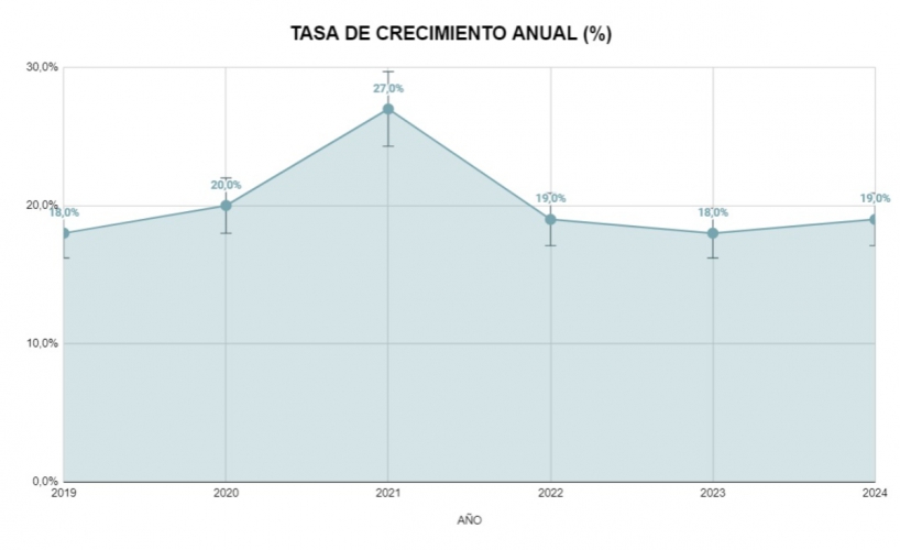 En 2023, la tasa de crecimiento se estabilizó nuevamente en el 18%, demostrando una resistencia en el sector pese a las fluctuaciones anteriores. Para 2024, se proyecta un crecimiento del 19%, lo que sugiere una ligera recuperación y una posible consolidación del mercado. Estos datos reflejan un entorno empresarial para las pymes en España que, aunque sometido a variaciones, muestra una capacidad de adaptación y resiliencia. La tendencia general sugiere un crecimiento sostenido, aunque con altibajos, indicando que las pymes han sabido enfrentar y superar diversos retos a lo largo de estos años.