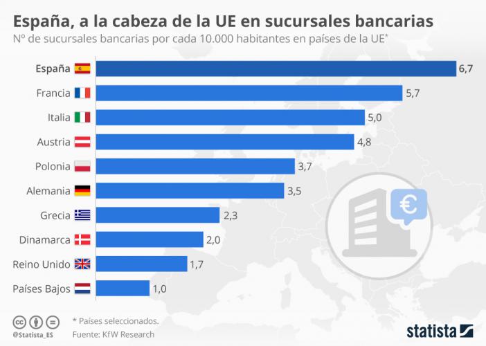 Lo cierto es que no hay más que salir a la calle para observar la cantidad de sucursales bancarias que existen cada pocos metros, a pesar de que en los últimos años ha decrecido el número de oficinas existentes. Curiosamente, a pesar de este dato, España continúa a la cabeza de la Unión Europea en cuanto al número sucursales bancarias por cada 10.000 habitantes, seguida por Francia e Italia.
