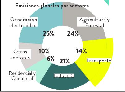 Donde más se emite es el sector de la generación de electricidad, seguido de la agricultura y el sector forestal, la industria, el transporte y el residencial y comercial (la gráfica es de un artículo de Alba Huerga en Plataforma Zeo).
