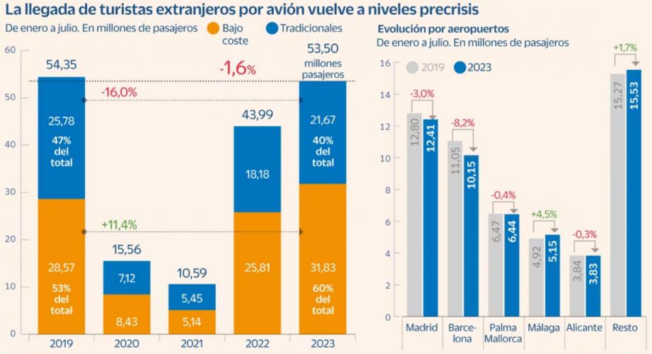 Entre 2019 y 2023, con la presencia de la pandemia, la participación de las aerolíneas de bajo coste en la contratación de pasajeros extranjeros ha aumentado en un 11,4%, mientras que la de las aerolíneas tradicionales ha disminuido en un 16%. Según las estadísticas de Aena hasta junio, que incluyen tanto pasajeros nacionales como extranjeros, solo las aerolíneas del grupo Iberia han logrado resistir la competencia de Ryanair y Vueling, siendo Easyjet, Air Europa y TUI las principales perjudicadas.