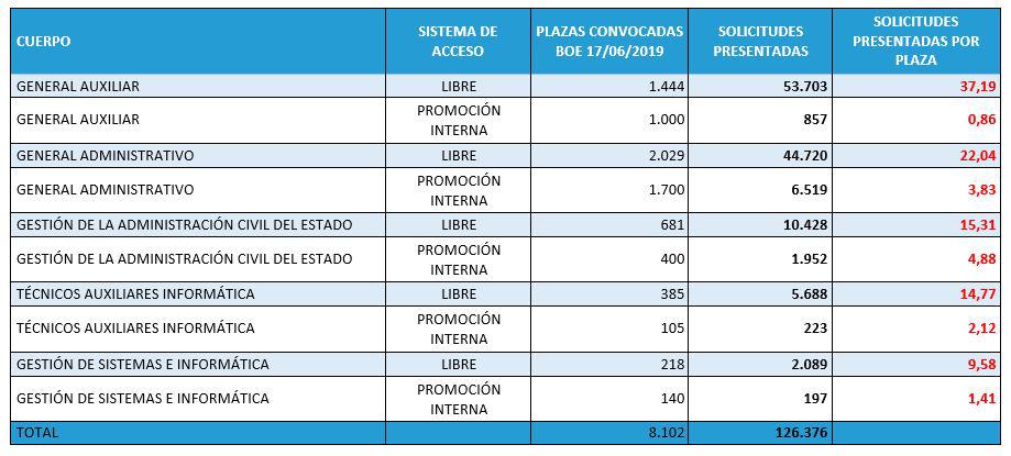 Se abren convocatorias con bastante periodicidad a lo largo del año. Madrid y Granada son de las más recurrentes a la hora de convocar. En 2018 se presentaron más de 41.150 instancias para 1.444 plazas ofertadas. Acudieron a realizar las pruebas más de 22.700 personas. Esto significó que había unas 15 personas por plaza convocada. En 2019, la Administración General del Estado recibió más 126.370 instancias para participar en las 10 convocatorias para ocupar casi 8.100 plazas. La cifra superó en más de un 71% a la misma del año anterior. En esa ocasión se incluyeron de un total de 1081 plazas, más de la mitad de ingreso libre y unas 400 promocionadas internamente para el Cuerpo de Gestión de la Administración Civil estatal; casi 3.730 para el Cuerpo General Administrativo del Estado y más de 2.440 para el Cuerpo General de Auxiliares. Se convocaron casi 360 plazas para el de Gestión de Sistemas Informático de la Administración del Estado. Asimismo, salieron 490 vacantes para el de Técnicos Auxiliares de Informática de la Administración Estatal. Algunas plazas se guardaron para personas con discapacidad (casi 600). Esto supuso un aumento de más del 55% con respecto al año anterior.