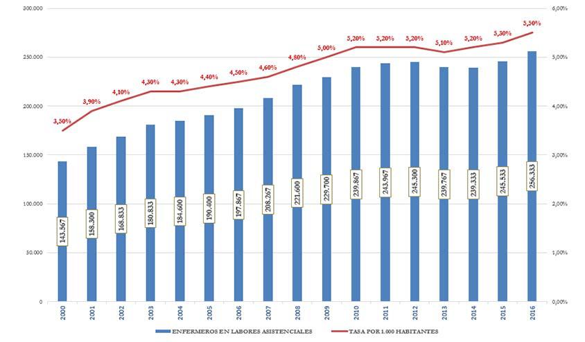 Por otra parte, las estadísticas de empleados en el mundo sanitario según la OMS indican que, a pesar de que como se puede observar en el gráfico adjunto las contrataciones van en aumento en España, nuestra ratio de profesionales Auxiliares en Enfermería es bastante inferior a la media de la UE, por lo que se prevé que sea necesario incorporar durante los próximos años a más de 130.000 Enfermeros y Auxiliares de Enfermería, de cara a asegurar el bienestar social en un futuro inmediato, para así alcanzar la media europea.