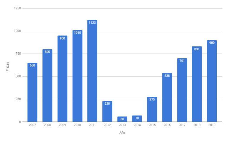 A día de hoy podemos apreciar que la cantidad de plazas aumenta con los años, hasta aproximarse a las cifras que se publicaban antaño, antes de la llegada de la crisis financiera que vivió nuestro país.