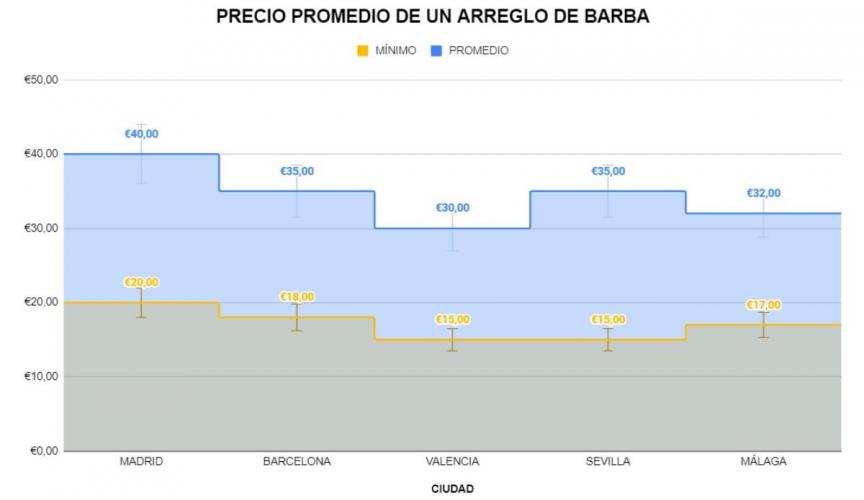 El precio medio de un arreglo de barba varía entre 15€ y 40€, dependiendo de la ciudad y el establecimiento. En Madrid, los precios oscilan entre 20€ y 40€, mientras que en Barcelona el rango es de 18€ a 35€. En Valencia, el coste medio es de 15€ a 30€, y en Sevilla los precios van desde 15€ hasta 35€. En Málaga, los precios para un arreglo de barba se encuentran entre 17€ y 32€. Estos precios reflejan la diversidad de servicios disponibles, desde opciones más básicas hasta tratamientos más completos y personalizados, lo que permite a los clientes elegir según sus necesidades y presupuesto.