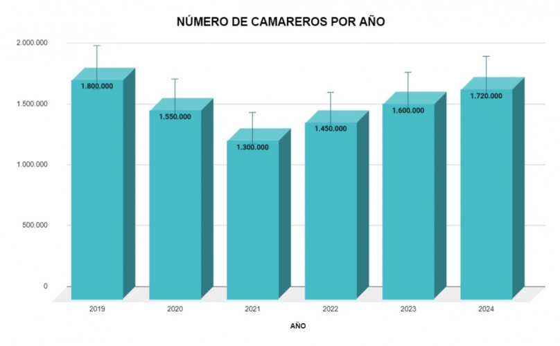 A partir de 2022, se comenzó a observar una recuperación progresiva en el sector. El número de camareros aumentó a 1.450.000 en ese año, y esta tendencia positiva se consolidó en los años siguientes. En 2023, la cifra alcanzó los 1.600.000, y se proyecta que continúe creciendo, alcanzando los 1.720.000 en 2024. Este incremento refleja una recuperación robusta del sector y un aumento en la demanda de servicios en la hostelería, subrayando la capacidad de adaptación y crecimiento del empleo en este ámbito tras la crisis provocada por la pandemia.