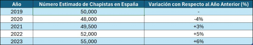 El sector de la chapistería en España ha experimentado una evolución interesante en los últimos años. Si bien la crisis económica de 2020 provocó una ligera disminución en el número de profesionales dedicados a esta actividad, la recuperación del mercado automovilístico y el aumento de la demanda de servicios de reparación han impulsado un crecimiento sostenido desde entonces. Según nuestras estimaciones, el número total de chapistas en España se situaba en torno a los 50.000 en 2019 y se ha incrementado hasta alcanzar los 55.000 en 2023, lo que representa un crecimiento del 10%. Este aumento se debe en gran medida al envejecimiento del parque automovilístico y a la mayor conciencia de los consumidores sobre la importancia de mantener sus vehículos en buen estado.