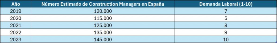 La demanda de Construction Managers en España ha experimentado una notable recuperación en los últimos años, pasando de 120.000 profesionales en 2019 a una estimación de 145.000 en 2023. Este crecimiento se ha visto impulsado por la reactivación del sector de la construcción, la creciente complejidad de los proyectos y la necesidad de perfiles altamente cualificados.