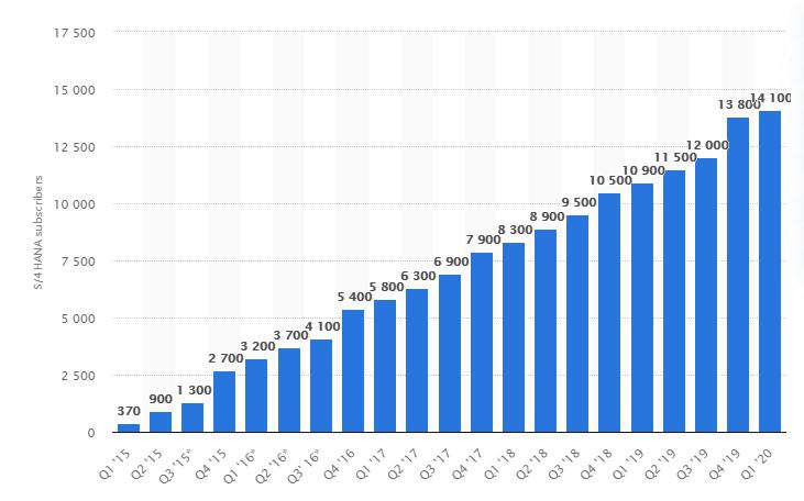 En el gráfico podemos observar una evolución del número de usuarios registrados en SAP S/4 HANA, a nivel global, entre los años 2014 y 2020 (lo que refleja directamente la cantidad de empresas que utilizan este software).
