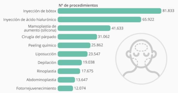 El mundo de la estética crece a pasos agigantados. Cada vez más personas, hombres y mujeres, acuden a centros de estética a una edad más temprana: la media de edad de personas que comienzan a acudir a realizarse tratamientos de belleza se sitúa entre los 28 y los 32 años, y esto incluye tanto cirugías como tratamientos no invasivos. En el siguiente gráfico podemos observar los tratamientos estéticos más populares en nuestro país: