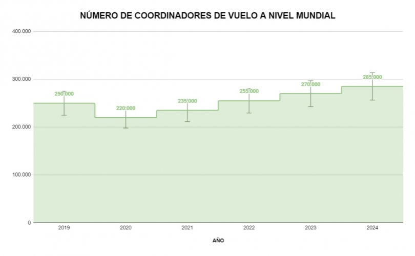 Desde 2019, el número de coordinadores de vuelo a nivel mundial ha mostrado una notable evolución. En 2019, había aproximadamente 250.000 coordinadores, cifra que reflejaba un equilibrio en el mercado laboral del sector aéreo. Sin embargo, en 2020, la pandemia de COVID-19 provocó una disminución significativa, reduciendo el número a 220.000 debido a la paralización global de los vuelos. A medida que la industria comenzó a recuperarse en 2021, el número de profesionales aumentó a 235.000, marcando el inicio de una lenta pero constante recuperación.