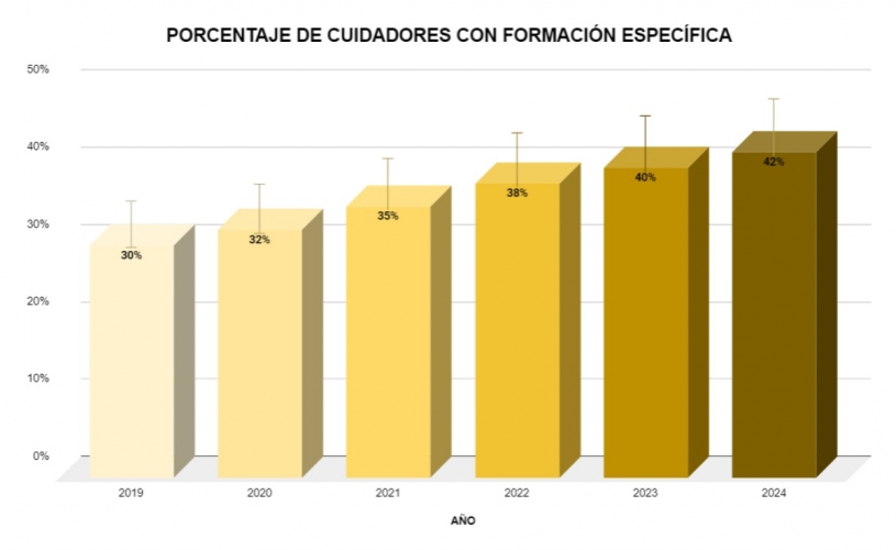 En paralelo, se ha observado un incremento en el porcentaje de cuidadores que cuentan con formación específica. En 2019, solo el 30% de los cuidadores disponía de formación especializada. Este porcentaje ha ido aumentando de forma continua a lo largo de los años, alcanzando el 32% en 2020, el 35% en 2021, el 38% en 2022, el 40% en 2023, y finalmente, el 42% en 2024. Este dato refleja una creciente profesionalización del sector, lo que supone una mejora en la calidad del servicio prestado.