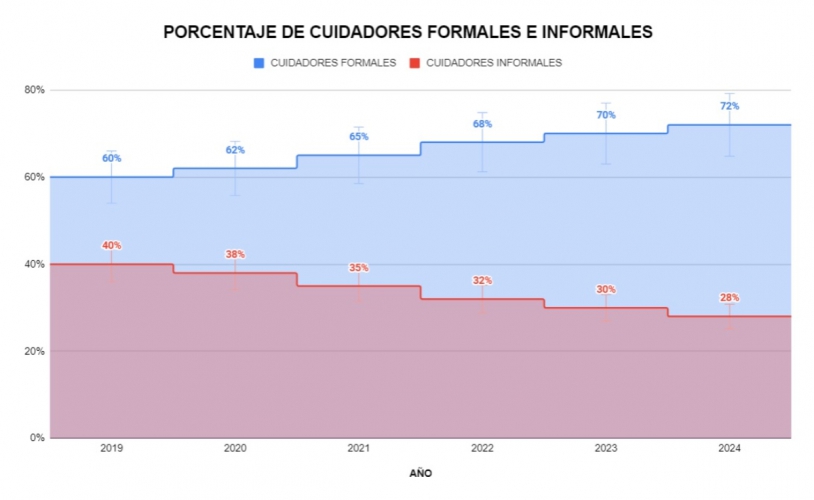 El crecimiento del número de cuidadores se ha acompañado de un cambio en la proporción de cuidadores formales frente a los informales. En 2019, el 60% de los cuidadores eran formales, mientras que el 40% eran informales. Para 2024, esta proporción ha variado significativamente, con un 72% de cuidadores formales y un 28% de informales. Este cambio sugiere una tendencia hacia una mayor formalización en el sector del cuidado.