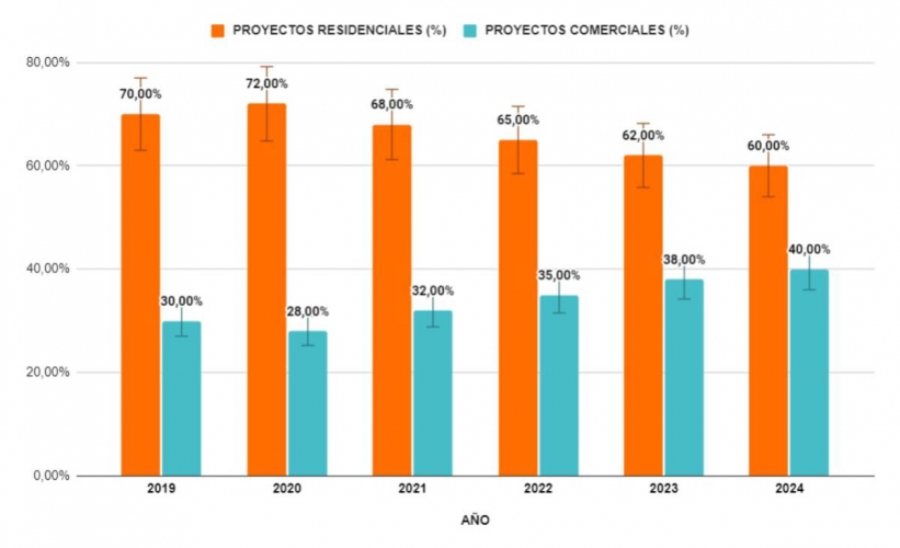 En cuanto a la distribución de los proyectos, en 2019 el 70% de los trabajos realizados por estos profesionales correspondía a proyectos residenciales, mientras que el 30% se centraba en el ámbito comercial. Con el tiempo, esta proporción ha ido variando, mostrando un aumento constante en el sector comercial. Para 2024, se prevé que los proyectos residenciales representen el 60%, mientras que los proyectos comerciales alcancen el 40% del total.