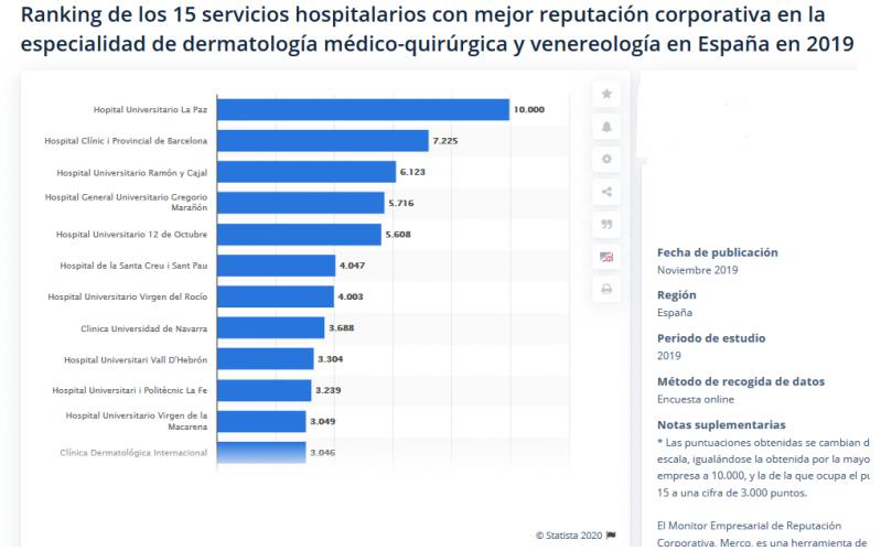 En Statista publicaban en 2020 una clasificación con datos de noviembre de 2019: los 15 servicios hospitalarios con mejor reputación entre los profesionales para la especialidad de dermatología médico-quirúrgica y venereología (nombre completo del MIR del dermatólogo), confeccionada mediante encuesta online llevada a cabo por Merco, el Monitor Empresarial de Reputación Corporativa, una de cuyas especialidades es la reputación sanitaria.
