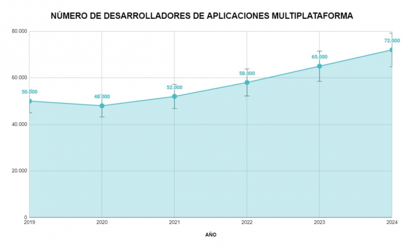 La demanda de desarrolladores de software ha experimentado un crecimiento sostenido en los últimos años, impulsada por la rápida digitalización y el aumento en la importancia de las aplicaciones móviles. Aunque en 2020 se observó un ligero descenso en el número de profesionales debido a la crisis económica generada por la pandemia, la recuperación fue notable en los años siguientes. Este repunte demuestra la resiliencia del sector y su capacidad para adaptarse a las nuevas necesidades del mercado.