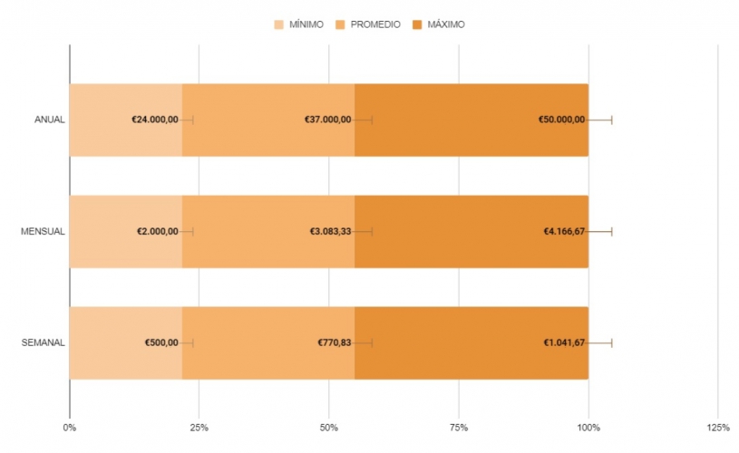 Por otro lado, los desarrolladores con mayor experiencia y especialización pueden alcanzar un salario anual de hasta 50.000 €, lo que representa alrededor de 4.166 € al mes o 1.041 € a la semana. Esta diferencia en la remuneración demuestra la alta demanda y el valor de las competencias en el desarrollo de aplicaciones multiplataforma, evidenciando cómo la experiencia y las habilidades influyen directamente en el nivel salarial.