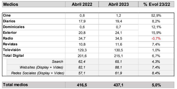 La inversión publicitaria a Abril de 2023 ha aumentado un 5% en relación al mismo periodo del año anterior alcanzando la cifra de 437,1 millones de euros.