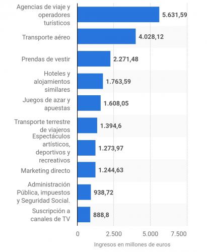 En este gráfico podemos apreciar los 10 sectores que más facturación suelen recibir en comercio electrónico en nuestro país. Como podemos apreciar, las agencias de viaje y los operadores turísticos encabezan la estadística.