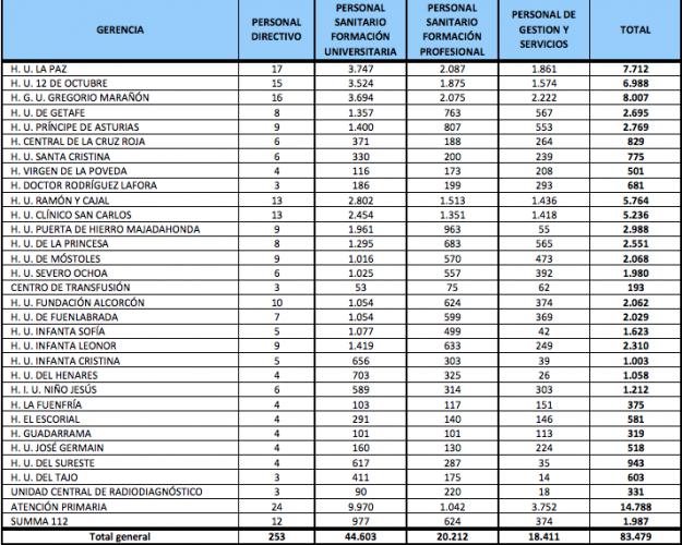 Según datos del portal estadístico de personal del servico Madrileño de salud, se han visto en la necesidad de repartir en catecogiar a los profesionales en diferentes centros sanitarios para una mejor administración y mejor atención.