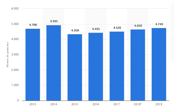Como ejemplo de entidad deportiva, los gimnasios son las instalaciones que más entrenadores profesionales contratan. En este gráfico podemos ver una evolución anual del número de gimnasios en España: