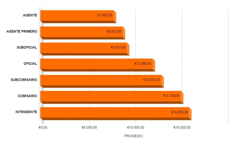 Los salarios varían significativamente según la categoría y la antigüedad del personal. Un Agente inicial tiene un salario medio anual de aproximadamente 7.892 euros. A medida que se asciende en la jerarquía, el salario aumenta progresivamente: un Agente Primero gana alrededor de 8.872 euros al año, mientras que un Suboficial percibe unos 9.321 euros. Los Oficiales tienen una remuneración media de 12.080 euros, y los Subcomisarios obtienen aproximadamente 13.031 euros.