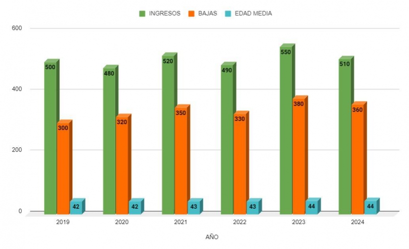 En los últimos años, se ha observado una tendencia en la incorporación y baja de efectivos dentro del cuerpo policial. En 2019, se sumaron 500 nuevos policías al cuerpo, mientras que 300 agentes se dieron de baja, lo que resultó en una edad media de 42 años entre los efectivos. A partir de entonces, las cifras de incorporación y bajas han fluctuado, con un aumento en el número de nuevos policías en 2021, alcanzando 520, y un crecimiento progresivo en la edad media, que llegó a los 44 años en 2024.