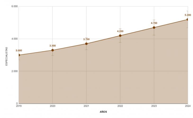 Aunque en 2023 la tasa de crecimiento se moderó ligeramente al 10%, la tendencia sigue siendo positiva. Se proyecta que para 2024 el número de especialistas en manicura y pedicura llegue a 5.200, con una tasa de crecimiento estimada del 9%. Este patrón de crecimiento constante refleja una creciente demanda y una expansión sostenida del sector, lo que indica una evolución favorable y una mayor consolidación de la profesión en España.