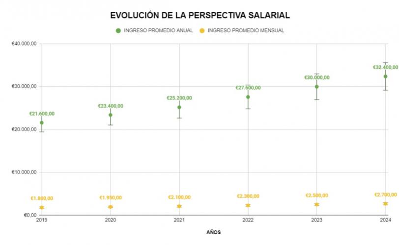 Este patrón de crecimiento continuó en 2023, cuando los ingresos promedio llegaron a 30.000 € al año y 2.500 € al mes. Para 2024, se prevé que el ingreso promedio anual sea de 32.400 €, que corresponde a 2.700 € mensuales. Este aumento progresivo en los ingresos refleja una tendencia sostenida de mejora económica a lo largo de estos años, indicando un fortalecimiento constante del poder adquisitivo en España.