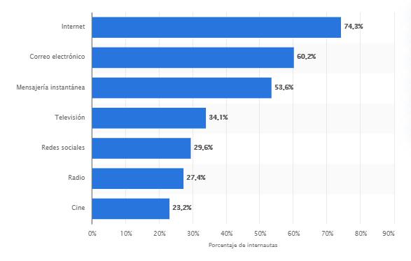 Un interesante punto de vista nos lo aporta la siguiente estadística: ¿cómo de difícil nos resultaría a los españoles vivir sin determinados medios audiovisuales y de comunicación? El gráfico nos lo muestra: se ilustra a continuación el grado de dificultad que representaba para las personas de nuestro país prescindir de ciertos medios, según un estudio realizado en 2018. Más del 70% de los encuestados afirmaron que no podrían vivir sin internet, más del 30% no conciben un mundo sin televisión, y más de un 23% uno sin cine.