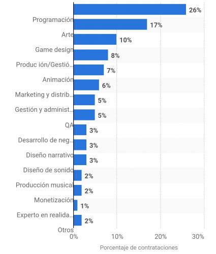El siguiente gráfico, con estadísticas del pasado año, muestra el porcentaje de nuevas contrataciones de empresas españolas de la industria del videojuego que hubo en función del perfil buscado: