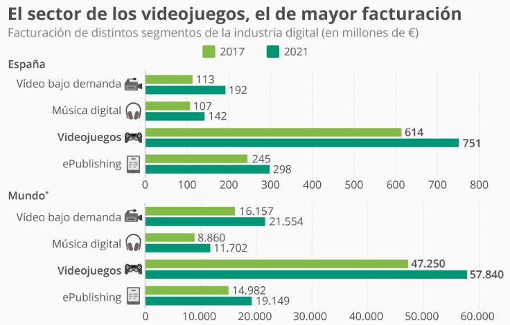 Segú el segmento de los videojuegos es actualmente y será en 2021 con una de las mayores facturaciones entre todos los medios digitales, tanto en España como en el resto del mundo. En este sentido, dentro del territorio español, se estima que este genere en 2021 una cifra de 751 millones de euros, una cifra mayor que el resto de medios. A este le sigue la industria de ePublishing, que ingresará este año 245 millones de euros.