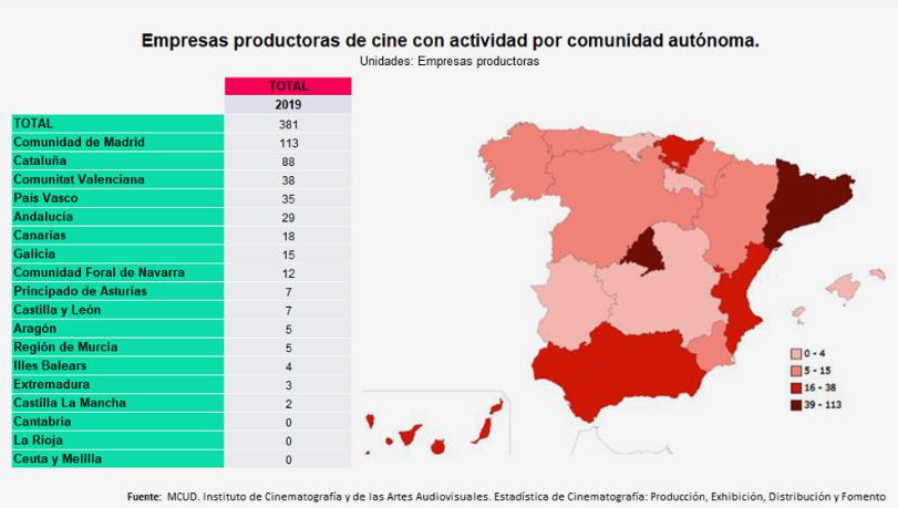 Por otro lado, España se encuentra en un gran momento en cuanto a producciones audiovisuales se refiere. Además, existen a día de hoy multitud de productoras cinematográficas, y nos podemos hacer una mejor idea obervando el siguiente gráfico: