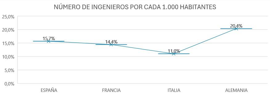 Según el último observatorio de la Ingeniería en España, el país cuenta con 750,000 ingenieros (el 3.7% jubilados), lo que se traduce en una proporción de 15.7 profesionales por cada 1,000 habitantes, superando a países vecinos como Francia (14.4) o Italia (11), aunque aún por debajo de Alemania (20.4). A pesar de estas cifras aparentemente favorables, el déficit de ingenieros para satisfacer las demandas del mercado es una realidad. El estudio destaca que durante los últimos años ha sido notablemente difícil para las empresas contratar ingenieros, con un tercio de ellas afirmando que es complicado o muy complicado hacerlo. Además, el 98% de los graduados en ingeniería están empleados y el 87% trabaja en campos relacionados con su carrera.