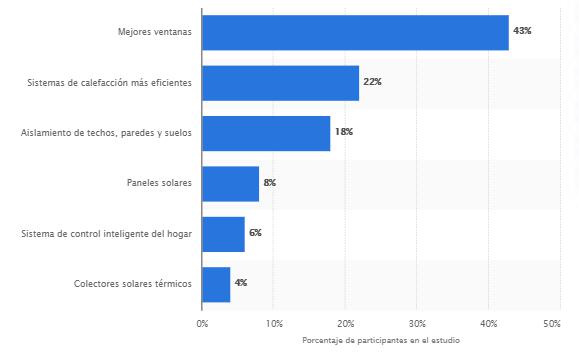 Podemos apreciar en el gráfico que un 43% de los encuestados realizó mejoras en sus ventanas, lo que demuestra lo necesario que es el oficio de instalador de ventanas dentro del mundo de la construcción. La lista continúa con la instalación de sistemas de calefacción, aislamiento de superficies, colocación de paneles solares, sistemas de control inteligente del hogar y colectores solares térmicos.