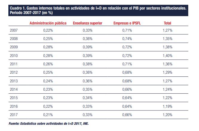 Según la Estadística sobre Actividades I+D del Instituto Nacional de ídem de 2017, se registró por primera vez desde 2010 un leve cambio de tendencia al alza. Se alcanzó un aumento del 1,20%.