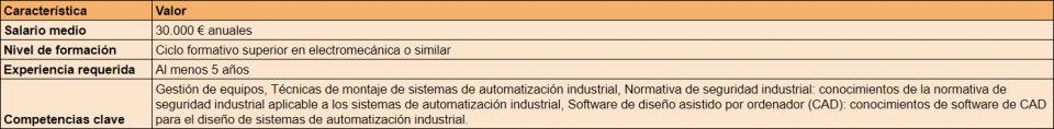 Según el Observatorio Nacional de la Formación Profesional, en 2022 se registraron en España 2.500 ofertas de empleo para profesionales en el ámbito de la automatización industrial. De estas, 700 eran para puestos de jefe de equipo de supervisión de montaje de sistemas de automatización industrial.